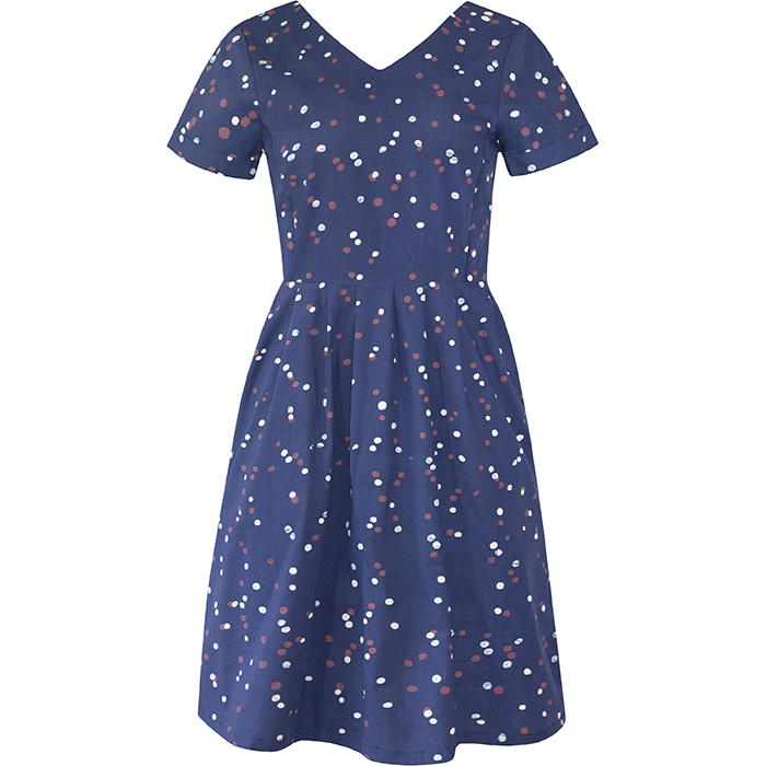 Fitted at bust and waist. V-neckline at front and back. Short sleeve with cuff. Side zip. Tuck details at waist. Knee length. 100% organic cotton GOTS Certified.